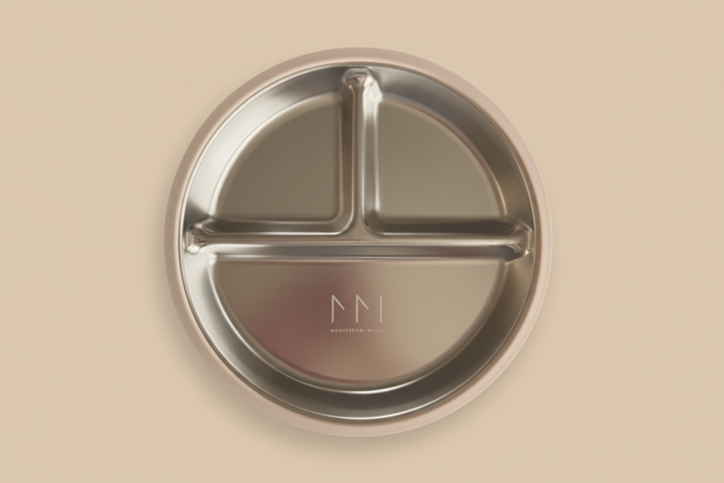 Our Realware Kids Plate is made from high-quality stainless steel with a removable silicone suction base and a matching lid for easy storage. It’s a Montessori-aligned mealtime essential that empowers toddlers to eat independently, while giving parents peace of mind (and fewer messes to clean up).