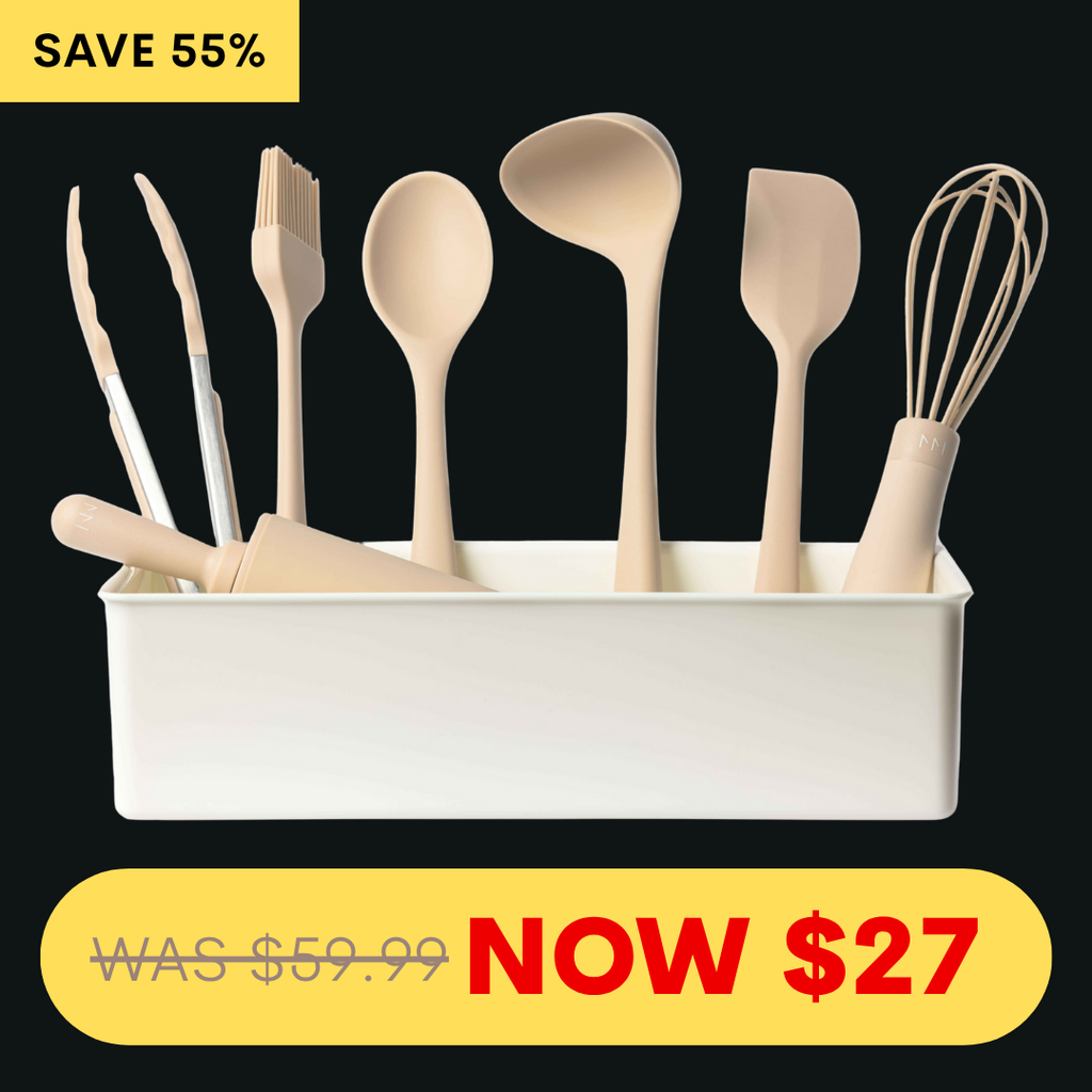 1 x Silicone kids-sized Spoon 1 x Silicone kids-sized Brush 1 x Silicone kids-sized Spatula 1 x Silicone kids-sized Soup Ladle 1 x Silicone kids-sized Rolling Pin 1 x Kids-sized Food Tong 1 x Kids-sized Egg Whisk 1 x Box Container - a practical & reusable storage solution!